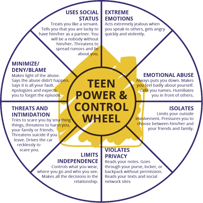 To start, take a look at this teen Power and Control Wheel. Power and Control Wheels are great tools to understand how the different forms of abuse can look in a realistic scenario, not just what they are. You may notice that certain types of abuse look different among teens than adults.