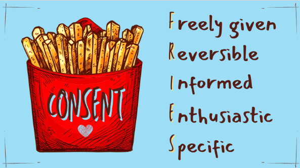 Consent is something that we use every day, and it’s important to make sure that we are giving and receiving good, positive consent. It’s an agreement, one in which everyone involved wants and accepts what’s happening. We can use the acronym FRIES as a gauge to know whether we have consent or not.